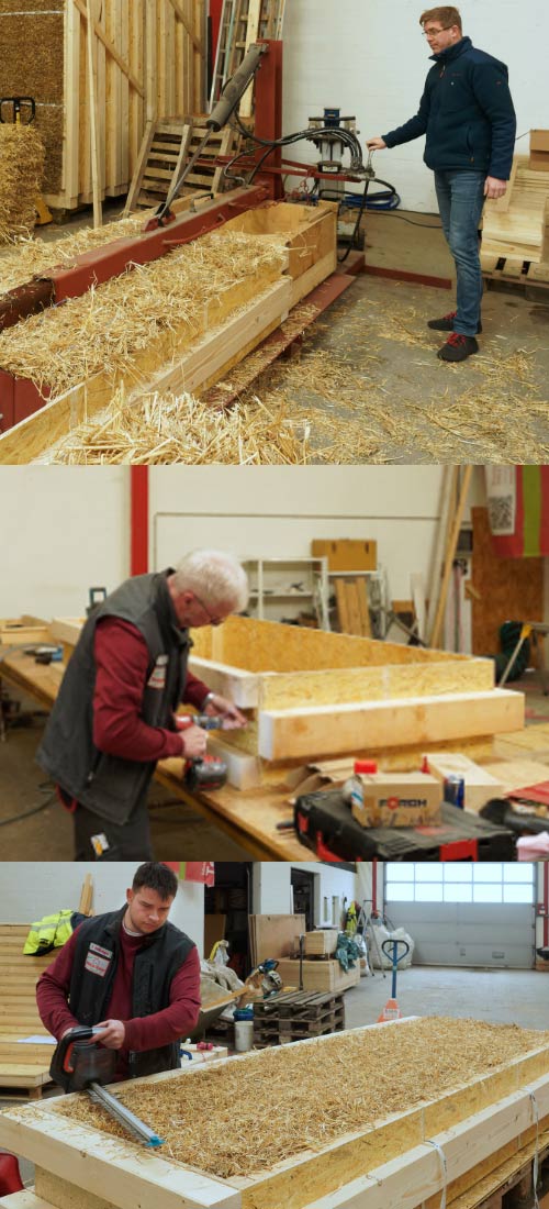Zuerst werden aus vorgeschnittenen Hölzern die Rahmen zusammengeschraubt. Danach werden die Strohballen in die Rahmen eingelegt und fest miteinander verpresst, um Kältebrücken in Form von Ritzen zu vermeiden. Dirk Schulz bedient die eigens für diesen Zweck von ihm entwickelte Hydraulikpresse. Anschließend bekommt das Stroh in den fertiggestellten Wandmodulen noch eine Rasur mit der Heckenschere, damit später keine Stoppeln aus der verputzten Wand gucken. Zum Schluss werden die fergen Wandelemente gebündelt auf Europaletten gestellt, um so später zur Baustelle transportiert zu werden. Dort können sie dank des Nut-und-Feder-Systems einfach zusammengesteckt werden.