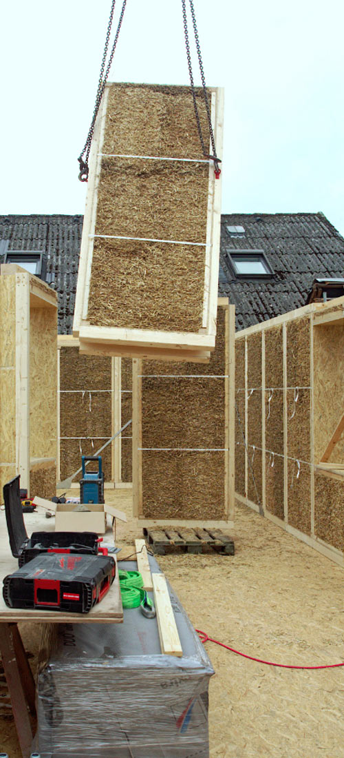 und nachhaltig zu bauen, gerade die Fernbedienung des Krans, an dem eines der Wandmodule schwebt, die im Winter in der Halle auf dem firmeneigenen Bauhof vorgefertigt worden sind. Die Module bestehen jeweils aus sechs Strohballen, die in einen Holzrahmen eingepresst worden sind. „Der Kran ist eigentlich überdimensioniert“, entschuldigt