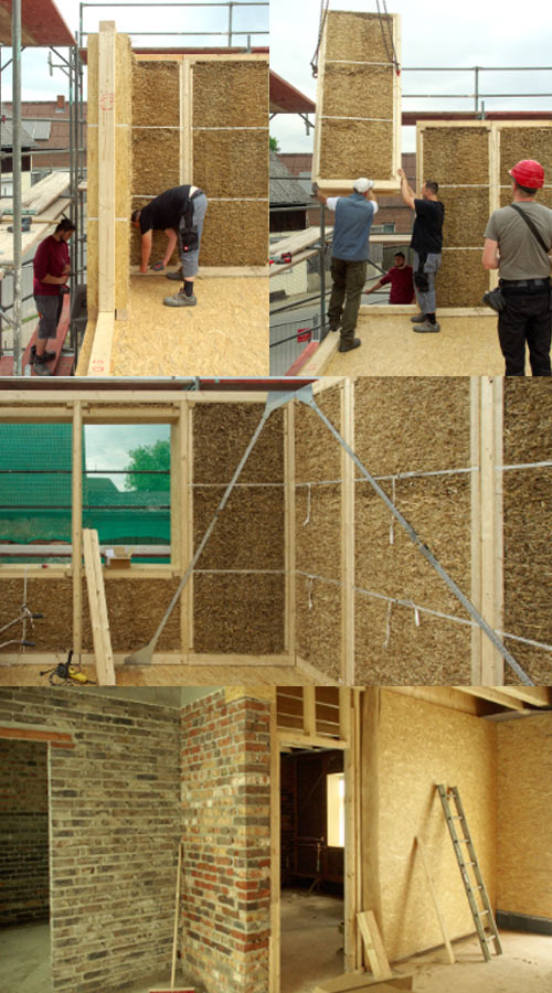 Modulbauweise. Wo es möglich ist, werden die Strohballen aus regionaler Erzeugung in einer Halle oder Scheune direkt vor Ort in die vorgefertigten Holzrahmen mit Nut-und-Feder-Stecksystem gepresst. Bei dem großen Bauvorhaben im Harz, für das rund 500 Strohballen benötigt werden, findet auf Wunsch des dortigen Bauherrn sogar Bio-Stroh Verwendung, das in unmittelbarer Nähe der Baustelle „geerntet“ worden ist.