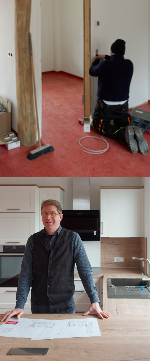 Bauherr Dirk Schulz mit den Plänen des Strohballenhauses in der oberen der beiden Wohnungen. Die Realisierung erfolgte mit dem Anspruch, möglichst ökologisch und nachhaltig zu bauen.