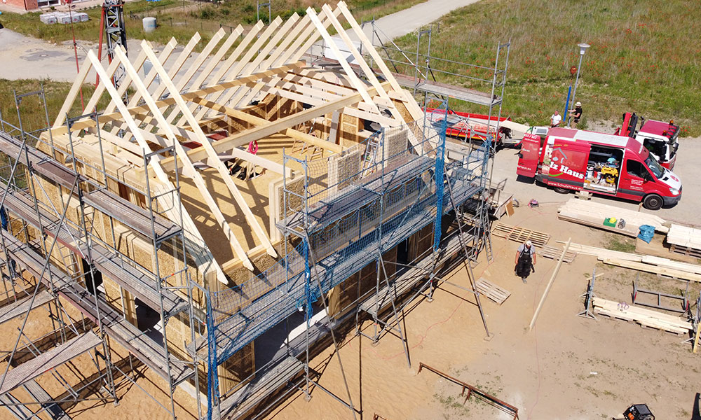 Die bei uns in der Vorfertigung hergestellten Wandmodule werden mit regionalen zertifiziertem Strohballen (36 cm dick) hoch wärme- und schalldämmend gefüllt.
